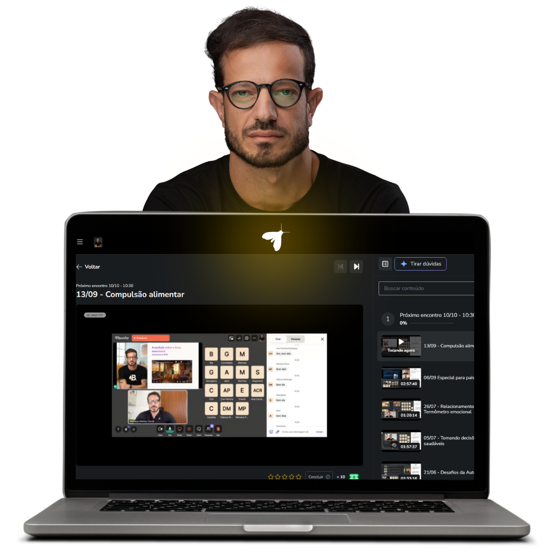 Somos a primeira comunidade a oferecer encontros de grupo terapêutico online, essa é a sua chance de a cada 15 dias tirar suas dúvidas ao vivo com Matheus, além de compartilhar suas experiências e ser acolhida por quem sabe do que você está falando